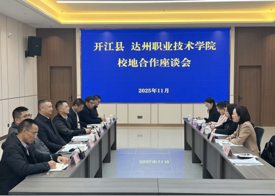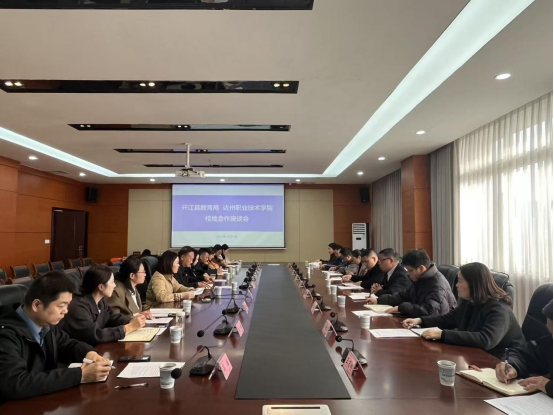 12月1日,开江县人民政府督导室主任吴诚顺、开江县职业中学党委书记郑三平一行到校调研,达州职业技术学院党委副书记、纪委书记陈立舜,数字文旅与艺术学院党政班子参加座谈会。就 共建 “珍珠产业学院”、联合贯通“3+2”人才培养模式等核心议题展开深入研讨与务实交流。 会上,达州职业技术学院数字文旅与艺术学院院长 董铃 与开江职业中学 党委书记郑三平 分别